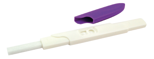2.- Sujete el mango y coloque la almohadilla absorbente del dispositivo en el chorro de orina durante 10 segundos.